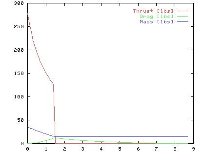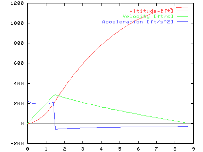 This chart shows the performance of the rocket. Initial acceleration is over 200 ft/s2 and reaches an altitude of over 1100 ft! Note the negative acceleration following "burnout" is much smaller than for Two-Can and Next Generation rockets. This is a result of the high mass of the empty rocket and the relatively small force due to drag. |